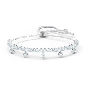 This attractive bracelet by Swarovski radiates stylish coolness. A row of sparkling white stones adorns the bracelet, with several additional stones dangling from it, accentuating the design. The bracelet closes with an adjustable sliding closure and is a great addition to matching bracelets in the trendy stacking style. A brilliant yet casual look, perfect to dress-up everyday outfits.