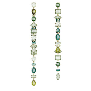 Inspired by nature, energizing emerald hues give these drop earrings a rich vibrancy. Each earring has two asymmetrical strands crafted with a mix of stone cuts, featuring a multitude of green tones complemented by a gold-tone plated setting. A beautifully bohemiam piece to gift to a loved one - or yourself.