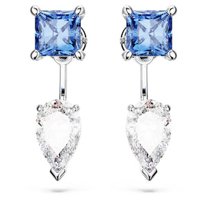 These attractive Mesmera earrings are a versatile and spellbinding choice. The pierced design is rhodium plated and features a pair of prong-set Swarovski Zirconia in pear and square cuts. Wear them as single blue studs or adjust the height of the detachable pear-cut drop to suit your style. A perfect gift to inject any evening outfit with elegance and color.