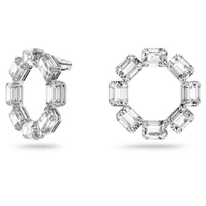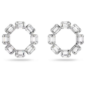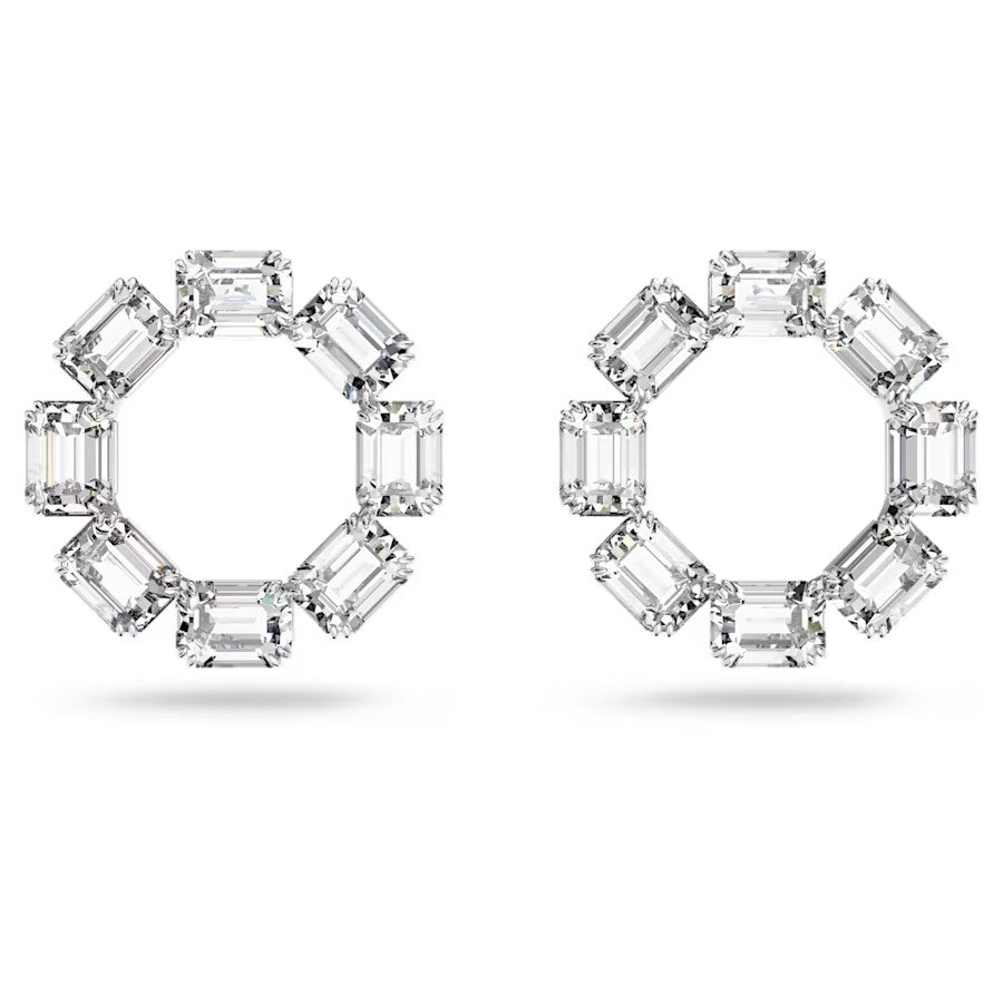 Formed from a perfect circle of octagon-cut, clear crystal, these geometric earrings are minimal in design yet make maximum impact. With a rhodium-plated setting, you'll want to wear these earrings with just about anything – consider a simple T-shirt for daytime, or sharp suiting for the evening. These earrings are part of the Millenia family, designed by Creative Director Giovanna Engelbert for Collection II.