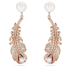 The gorgeous colors and natural shapes of these feather-inspired pierced earrings will add light elegance to your style. Each rose gold-tone plated piece features a single Swarovski Crystal Pearl with a beautiful feather motif that hangs beneath in shimmering pink pavé and Swarovski Zirconia. A nature-inspired gift for yourself or a loved one.