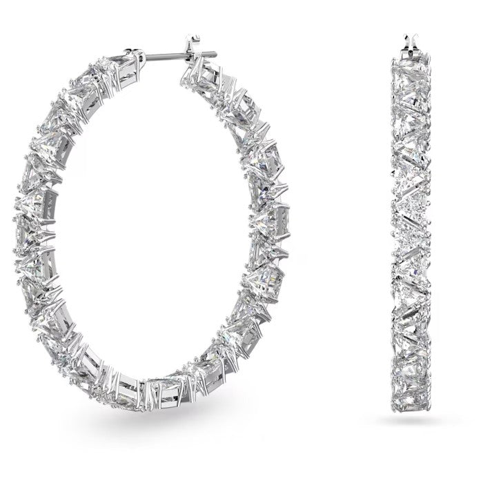 A meeting of delicate precision cutting and magical design, these earrings are crafted from rows of interlocking brilliant triangle step cut clear stones, set on a classic hoop form. A new jewelry essential you’ll wear with everything, over and over again. These hoop earrings are part of the Millenia family, designed by Creative Director Giovanna Engelbert for Collection I.