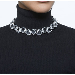 This timeless necklace will make a glamorous addition to your everyday wardrobe. Featuring oversized trillion cut clear crystals in a sleek rhodium plated setting, it is a shining example of bold simplicity. Wear it to elevate a shirt collar by day, or sleek suiting at night. This necklace is part of the Millenia family, designed by Creative Director Giovanna Engelbert for Collection I.
