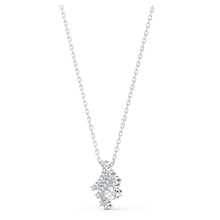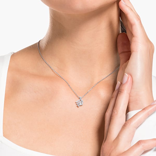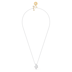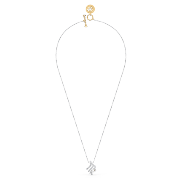 This pendant by Swarovski is inspired by the sign of Virgo. Representing hard work and an analytical mind, it traces the sign's symbol in sparkling clear crystal pavé centered around a white stone, evoking the stars of the zodiac. The complementary chain is fastened with a t-bar closure that is adorned by a shimmering coin displaying a sun on one side, with elemental symbols on the flip side. Wear the closure at the back or the front, either with the zodiac motif or without it to create many different looks: ideal to personalize your style, especially when layered with matching pieces of jewelry. A perfect gift for those born under Virgo.