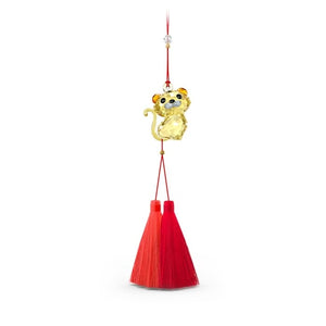 Celebrate 2022 with this cute tiger ornament, which perfectly embodies the charming and friendly character that those born in the Year of the Tiger are said to have. Very playful and fun, it sparkles with 396 facets of yellow, brown and clear crystal. The dual red and orange tassels and thread, gold-tone metal beads and black print add more auspicious color and intricate detail to the overall design. It is a perfect gift for Chinese New Year or any other occasion, especially when combined with the matching Tiger figurine. Decoration object. Not a toy. Not suitable for children under 15.