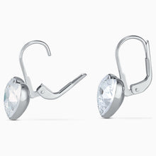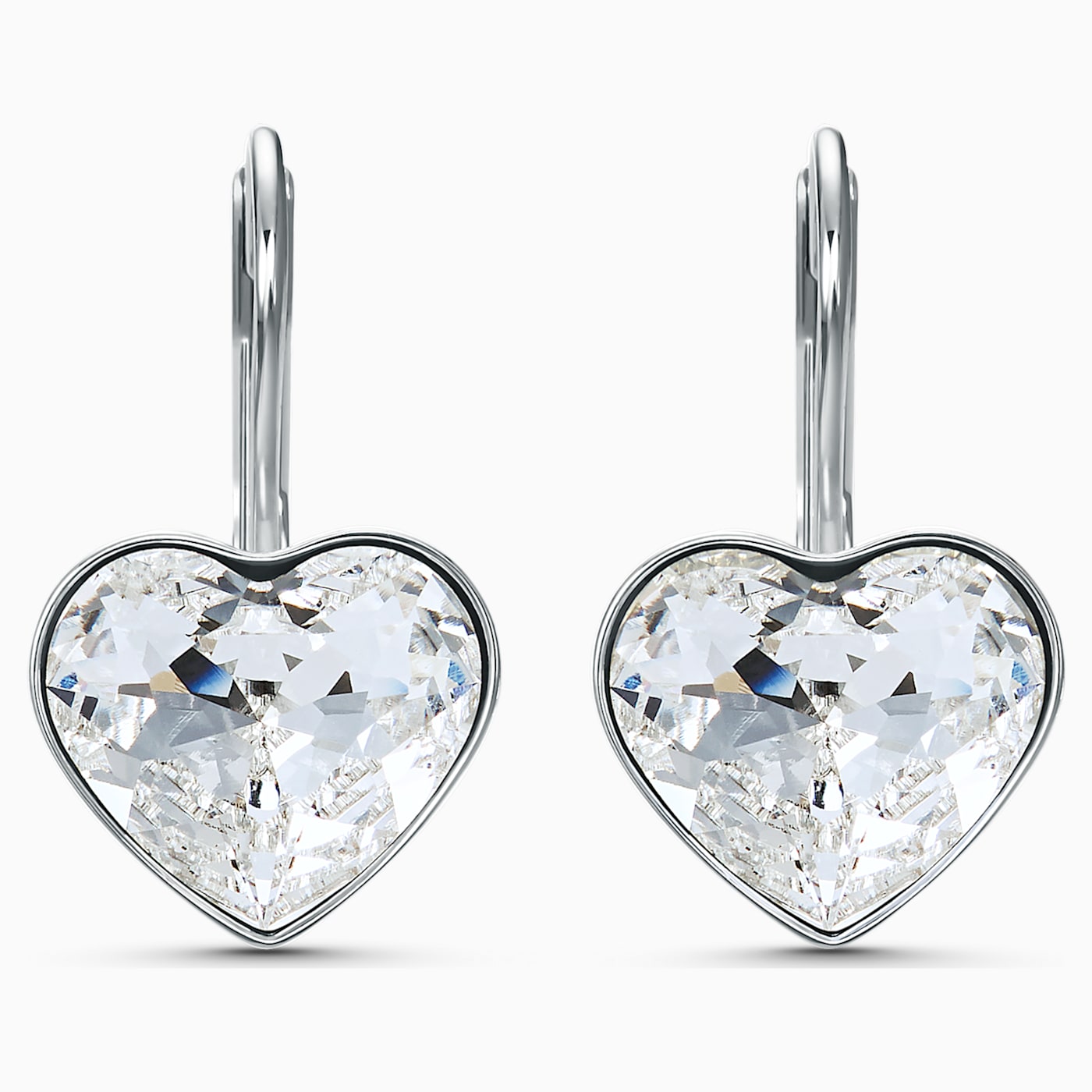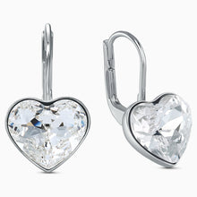 Two heart-shaped clear crystals form the centerpiece of this pair of Swarovski earrings. Placed in a discreet, rhodium-plated setting, the hearts refract incoming light brilliantly. These pierced earrings are the perfect complement to any elegant outfit and a great gift for a special occasion.