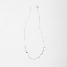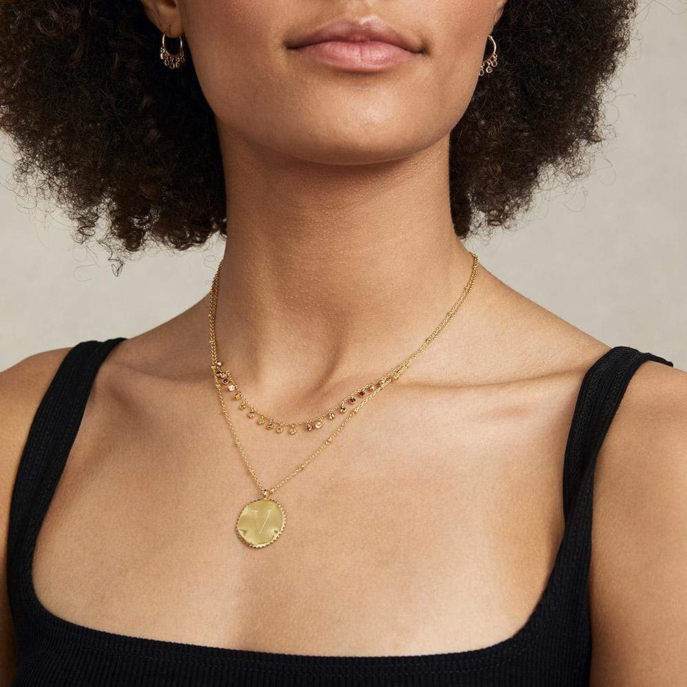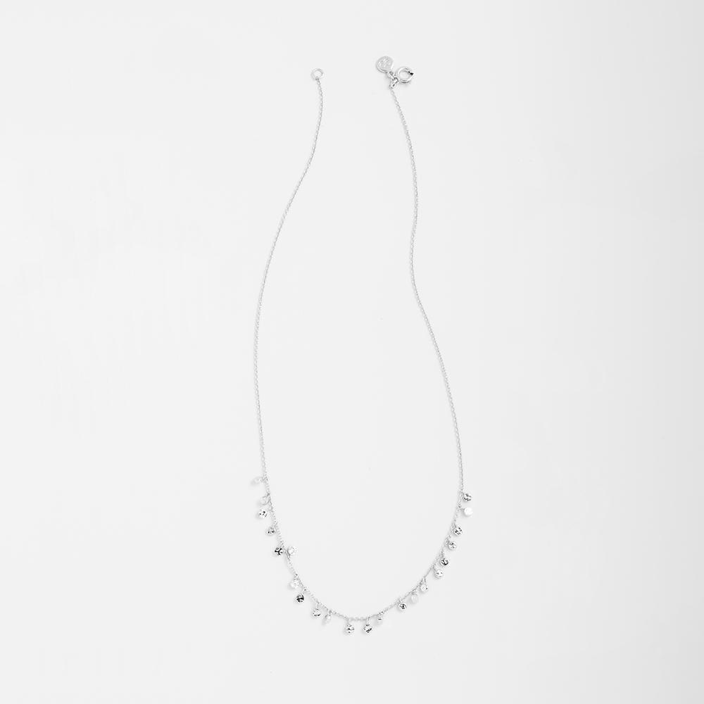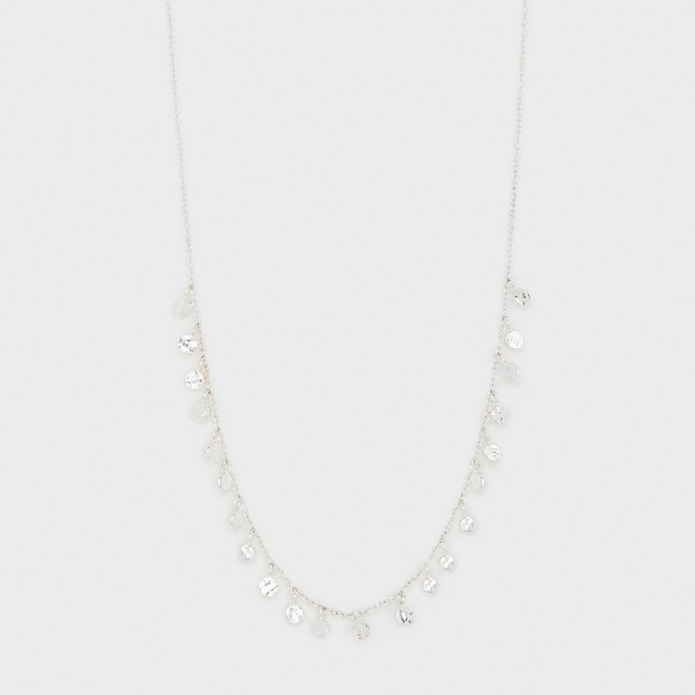 Dainty metallic discs accent the bottom of a slender strand necklace, adding shimmer to a versatile piece designed to delicately rest along the collarbone.