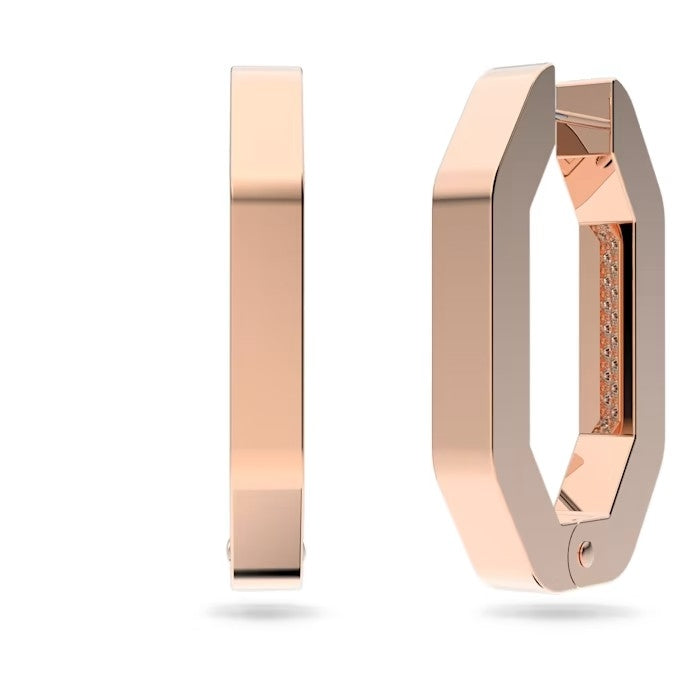 Celebrating our iconic pavé technique, these intricately detailed yet boldly constructed medium octagonal hoop earrings make a modern statement. Delicate white crystals embedded in rose gold-tone plated settings highlight an industrial-inspired design that you can wear alone, or stacked on the ear with other pieces from the Dextera family. These earrings are part of the Dextera Family, designed for Collection III.