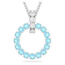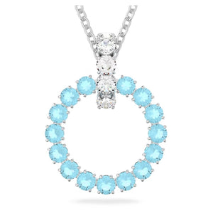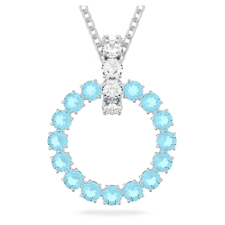 Inspired by royal jewelry, this eye-catching pendant makes a bold statement, featuring interlocking hoops of serene aquamarine and clear crystals set on a sleek rhodium plated chain. Wear it to your next event with matching pieces from the Exalta family.