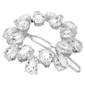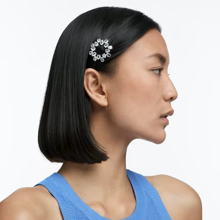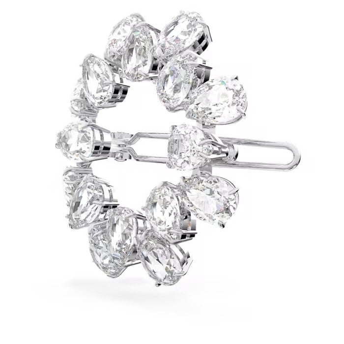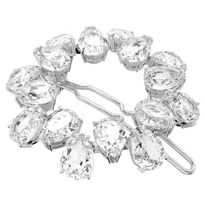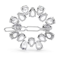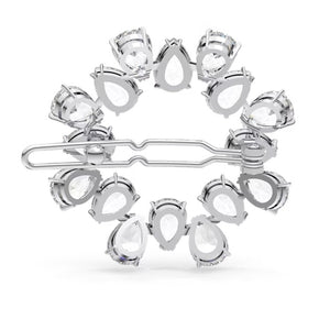 Adorn any hairstyle with this elegant hair clip, artfully formed from a sculptural circle of clear pear cut crystals. Finished with a subtle rhodium plated clasp closure, this piece makes a dazzling yet modern impact for day, or for evening.