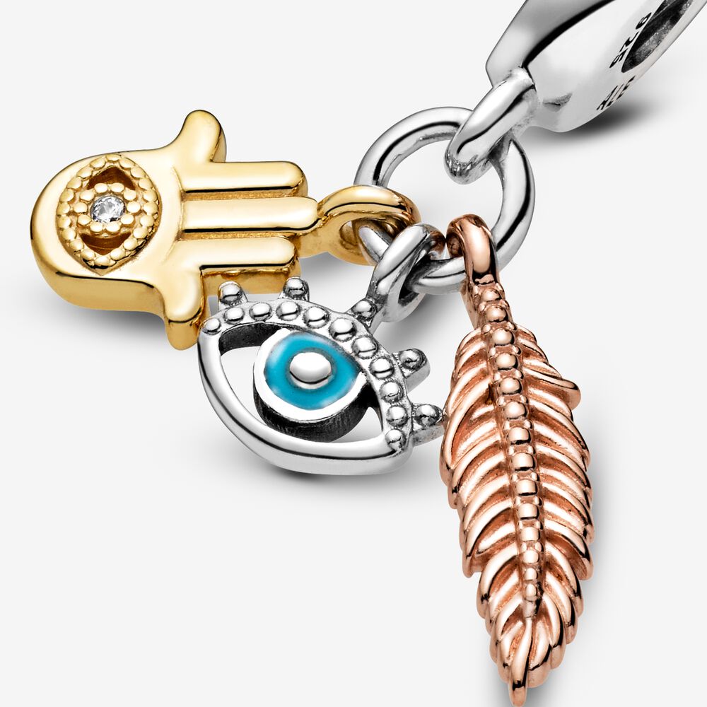 Show you’re a true citizen of the world with the hamsa hand, all-seeing eye and feather dangle charm. Feel the powerful symbols protecting you at every step when you wear this tri-colored charm in Pandora Shine™ (18k gold-plated unique metal blend), Pandora Rose™ (14k rose gold-plated unique metal blend) and sterling silver. Featuring clear cubic zirconia for extra sparkle and blue enamel details on the all-seeing eye, this charm is inspired by inclusive spirituality and embracing different faiths.