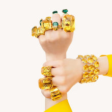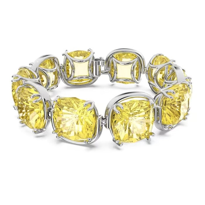 Combining a sense of mystery with extravagance, this bracelet gives the illusion of floating stones. It’s expertly crafted from a row of oversized, yellow, cushion-cut crystals, cradled in a sleek prong setting. Style yours over elegant, black evening gloves, or a simple, long-sleeved shirt to elevate your daytime look. This bracelet is part of the Harmonia family, designed by Creative Director Giovanna Engelbert for Collection II. How to close and open it: place the rounded baton into the widest point of the opposite hole and slide it down to the lowest point. Once in place, lower the D-ring security catch on top to secure the fastening. To open, lift up the D-ring security catch and slide the baton towards the widest point to release.