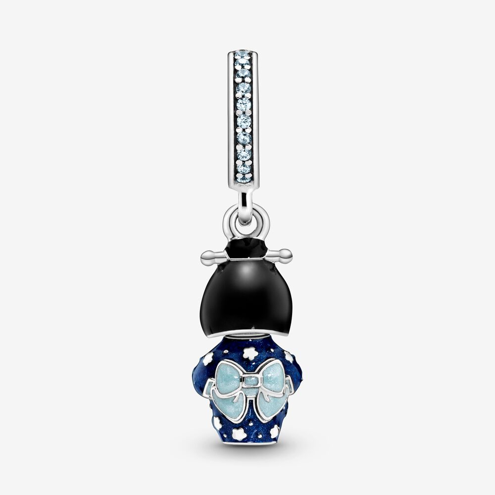 Geishas are the classic symbol of Japanese culture and represent feminine power, mystery and intrigue. The Pandora Japanese Doll Charm wears the iconic kimono fastened with a large obi knot and finished in shimmering blue enamel. This Japanese doll charm has 23 bead-set forever blue crystals atop sterling silver. Wear it as a symbol for femininity and intrigue or as a way to express your love of Japanese culture.