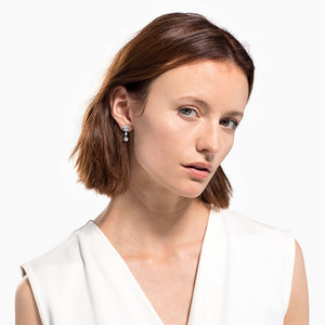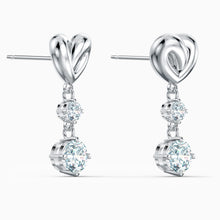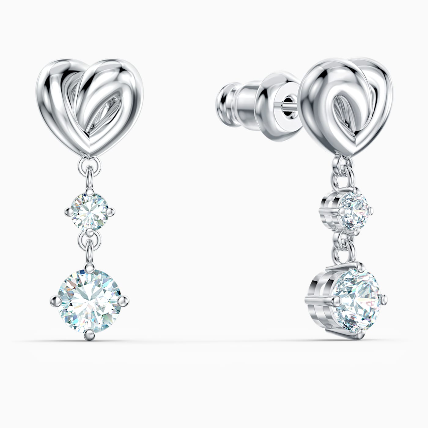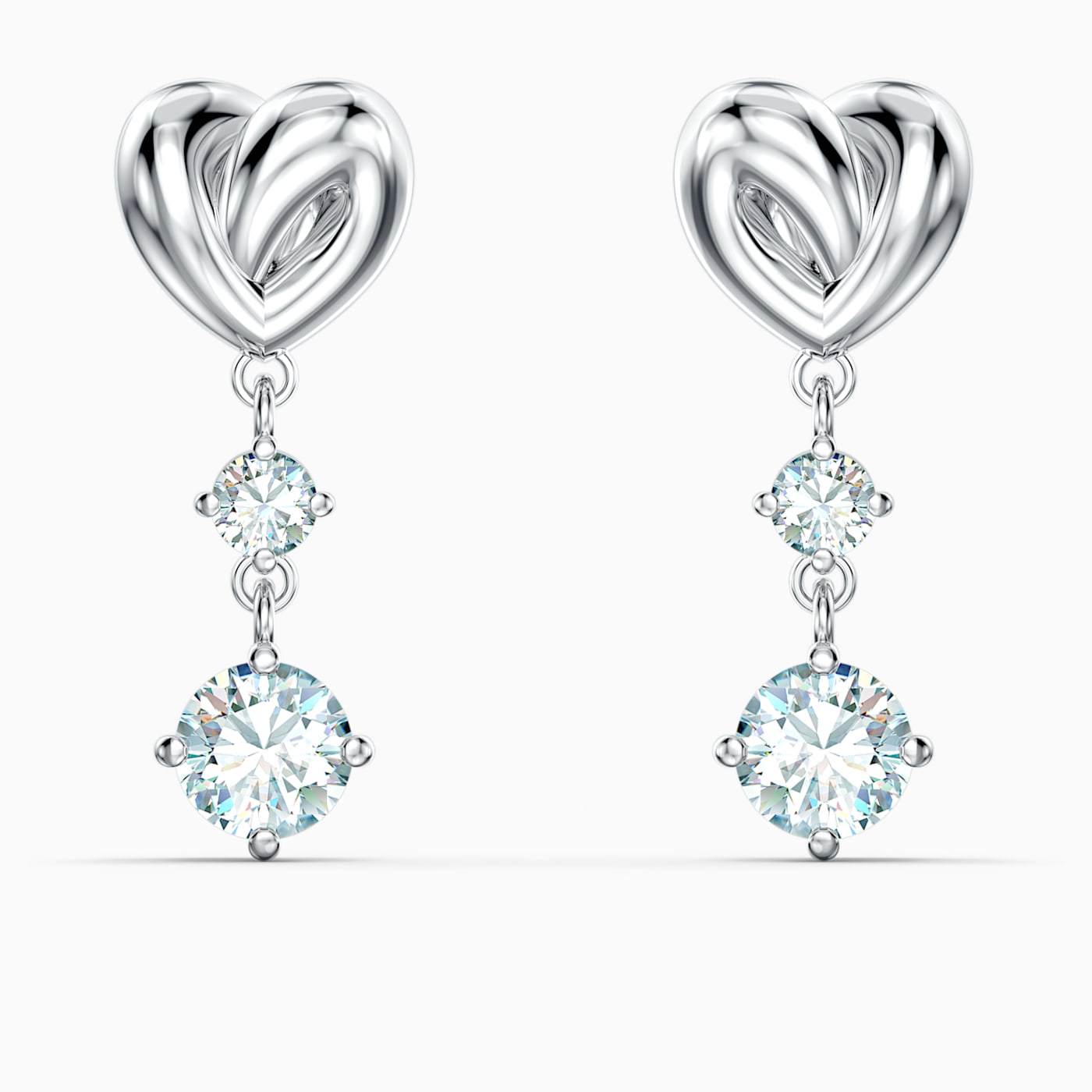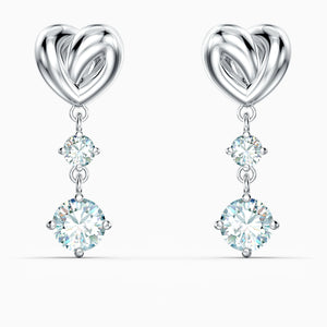 This pair of Swarovski pierced earrings feature two expertly crafted crystals each. Creating a kaleidoscope of reflections, the sparkling and elegant design also includes a heart-shaped element for a truly distinctive and romantic look. Delightful detailing and rhodium plating add further style.
