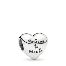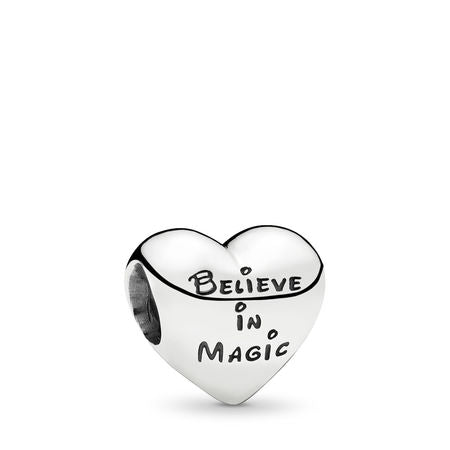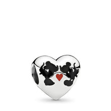 Do you believe in magic? Celebrate Disney's most-loved couple with this sweet heart-shaped charm. Finely crafted in sterling silver with enamel applied by hand, the charming design features the instantly recognizable silhouettes of Mickey Mouse and Minnie Mouse sharing a kiss. Wear it on its own or add other Mickey Mouse and Minnie Mouse Pandora charms to build the perfect Disney charm bracelet.
