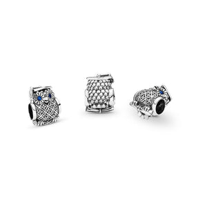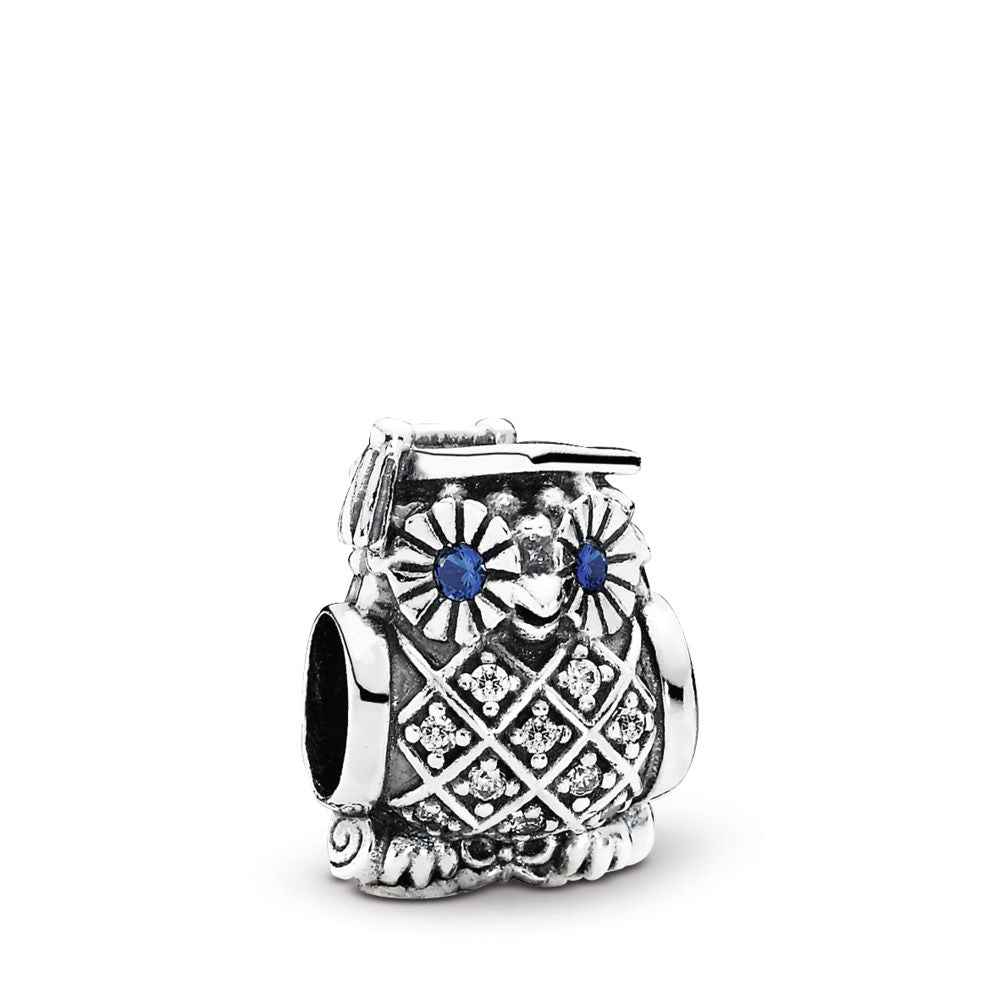 A traditional symbol of wisdom, this detailed owl charm is especially wise with its graduation cap and scroll. Rendered in sterling silver, this charming owl features striking blue crystal eyes and sparkling cubic zirconias. It makes a great graduation gift or encouragement prior to a big exam.