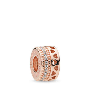 This highly detailed PANDORA Rose™ spacer will give your bracelet a warm and elegant look with its lines of sparkling cubic zirconia and cut-out hearts. Combine it with other PANDORA classics for maximum effect.