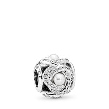 Glittering ribbons wrap around this sterling silver charm, creating delicate nests for white crystal pearls to nestle in. Over 100 cubic zirconia stones bring this lustrous beauty to life, making it a must-have for lovers of pearly sheen and embellishments.