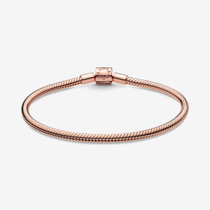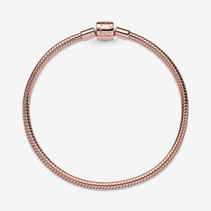 Never forget who you are and where you came from with this snake chain bracelet. The Pandora Moments Barrel Clasp Snake Chain Bracelet is hand-finished in Pandora Rose™ (14k rose gold-plated unique metal blend) and represents a classic piece of Pandora's heritage. The barrel clasp was a part of our first ever snake chain bracelet designs, which we've now updated with sleeker details. Celebrate Pandora’s history with this iconic piece and let it live on as a part of your collection.