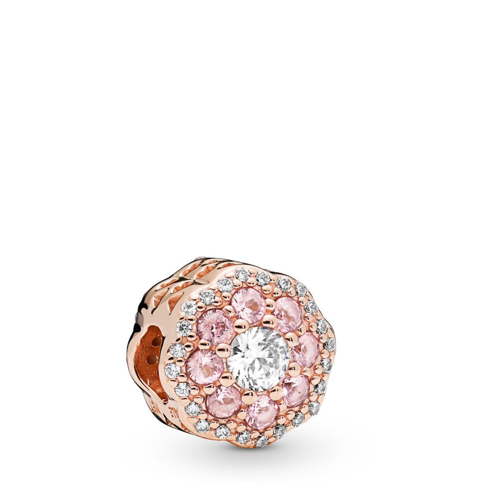 Wear a lasting bouquet with this pretty flower charm, made from blush-pink Pandora Rose and set with pink crystal petals and a halo of clear stones. Cut-out heart details along the edge lend a romantic feel to the piece.