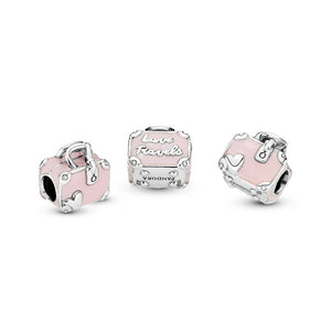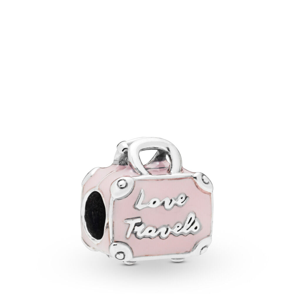 This pretty pink enamel and sterling silver suitcase charm is part of our series of travel charms. Detailed at the corners as well as on its luggage tag with the Pandora crown O and featuring pretty hearts, the cute case is inscribed with the words "Love travels." Take it with you on your next adventure — on a bracelet or even as an alternative to a necklace pendant.