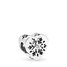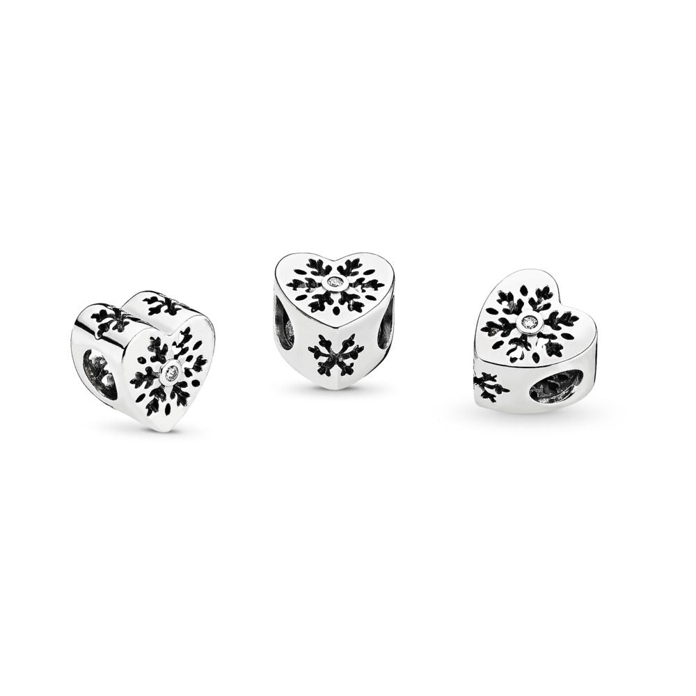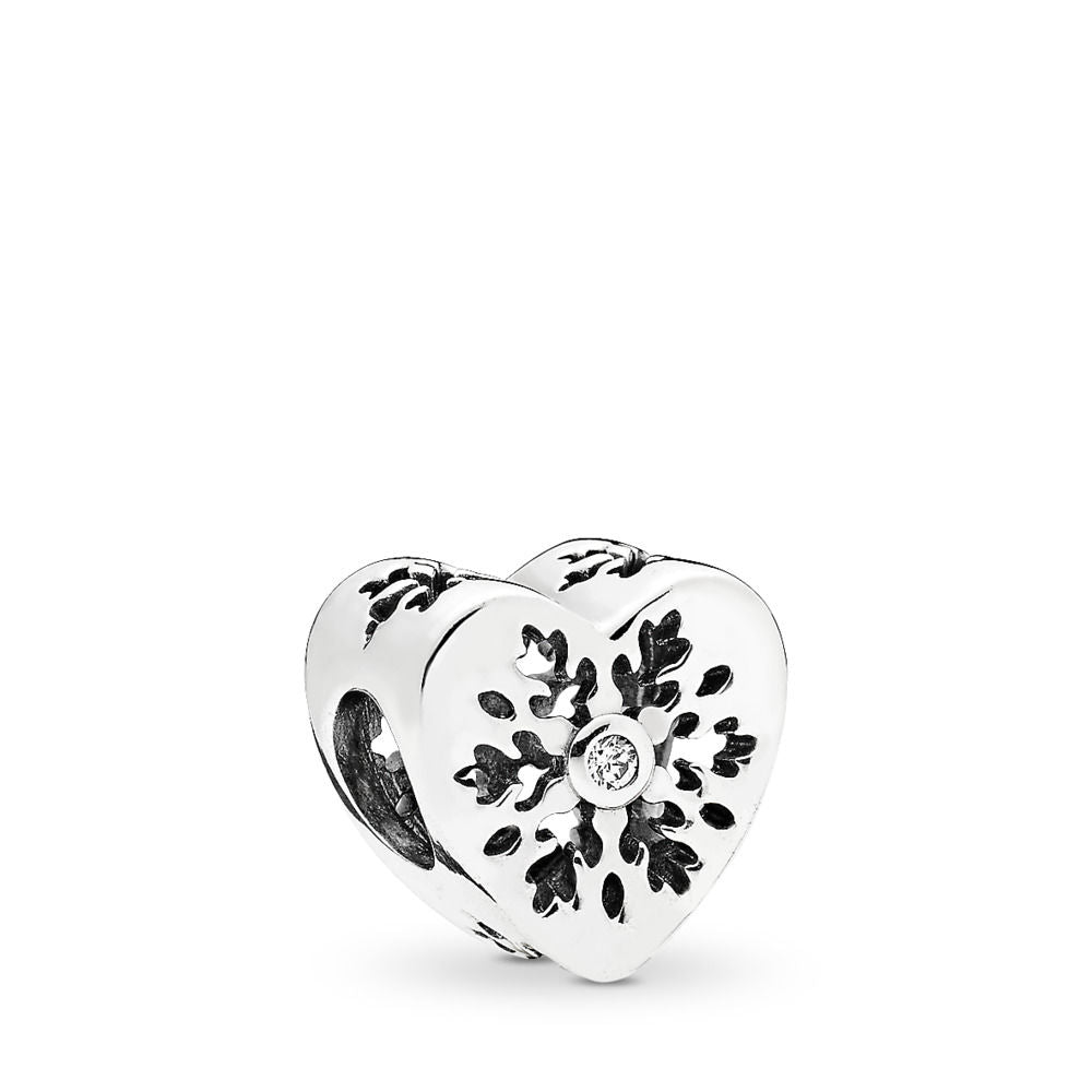 Simple yet nonetheless striking, this sterling silver heart charm features lovely cut-out snowflakes and bright cubic zirconia centers, making it ideal for chilly chic stylings.