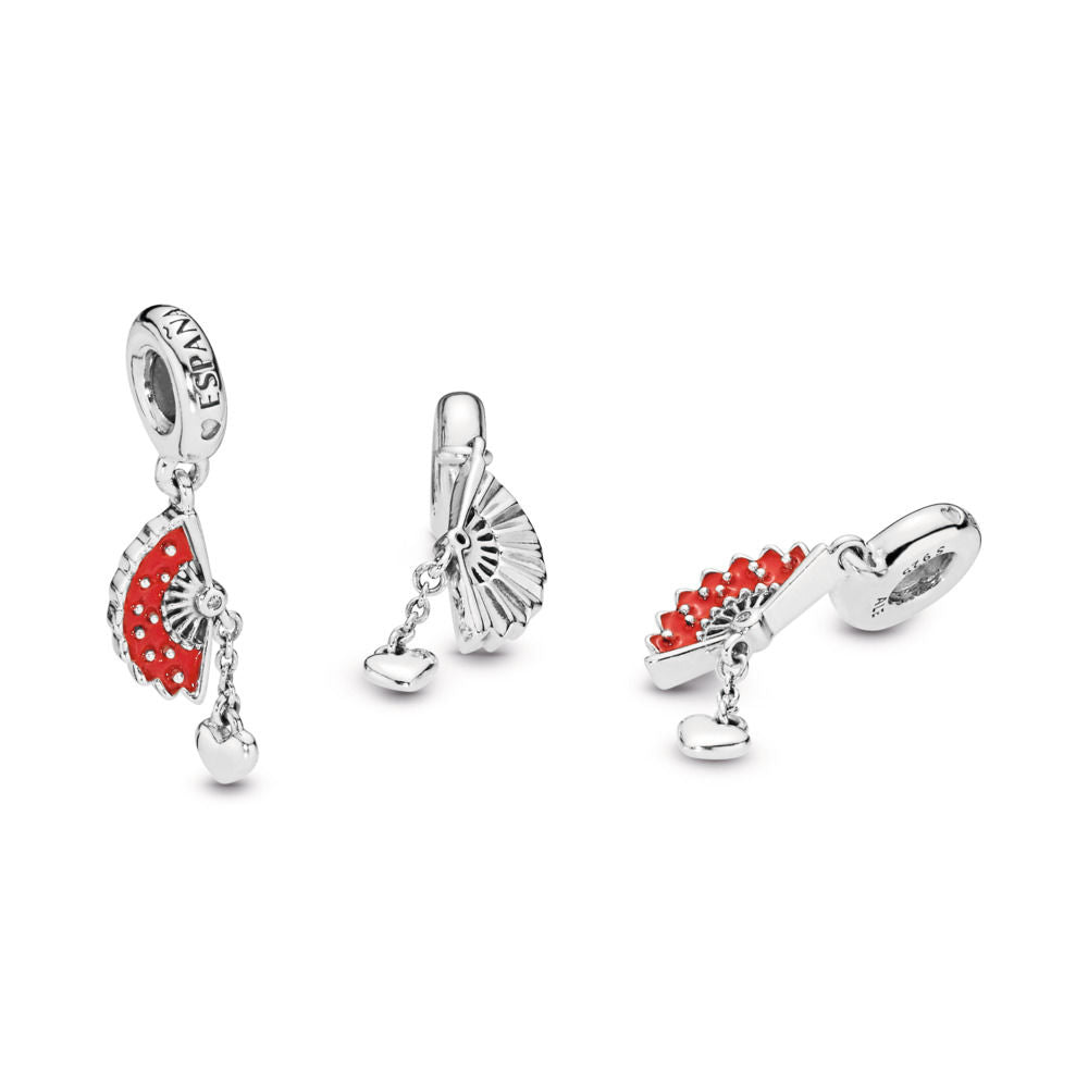 Show your love of Spain with this fan-shaped dangle charm, touched with bold red enamel. The sterling silver design is engraved with the word 'España' and holds a miniature heart dangle.