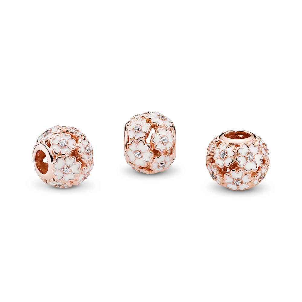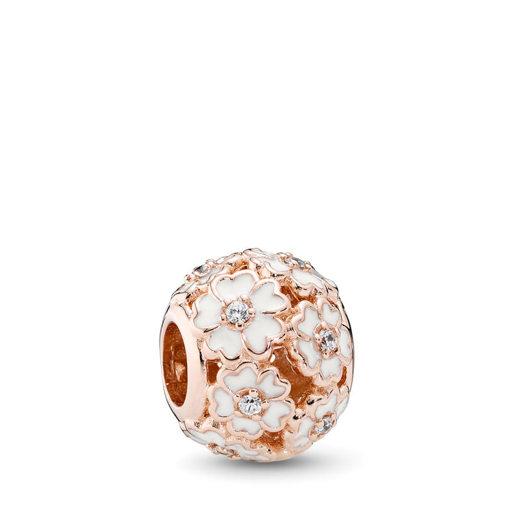 A garland of graceful primrose flowers embellished with hand-applied white enamel and shimmering stones lends a feminine and delightful look to this pink-colored charm in PANDORA Rose
