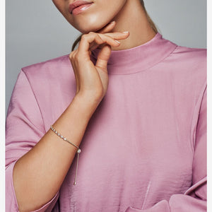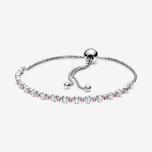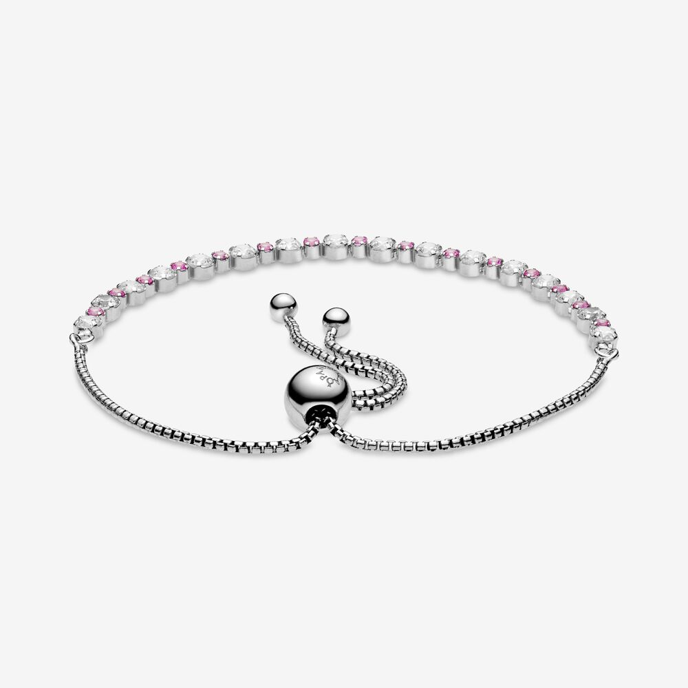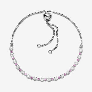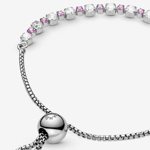 Add a sophisticated pink note to your look with this sparkling sterling silver slider bracelet. Hand-finished with two tones of shimmering details, this tennis bracelet features clear cubic zirconia and pink synthetic sapphires in alternating sizes, adding a layer of contrast to the piece. The bracelet features a handy adjustable slider clasp for a perfect fit. Add a classic and versatile staple to your collection and wear this stylish piece years to come.