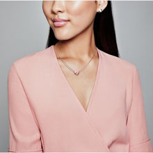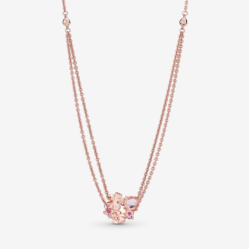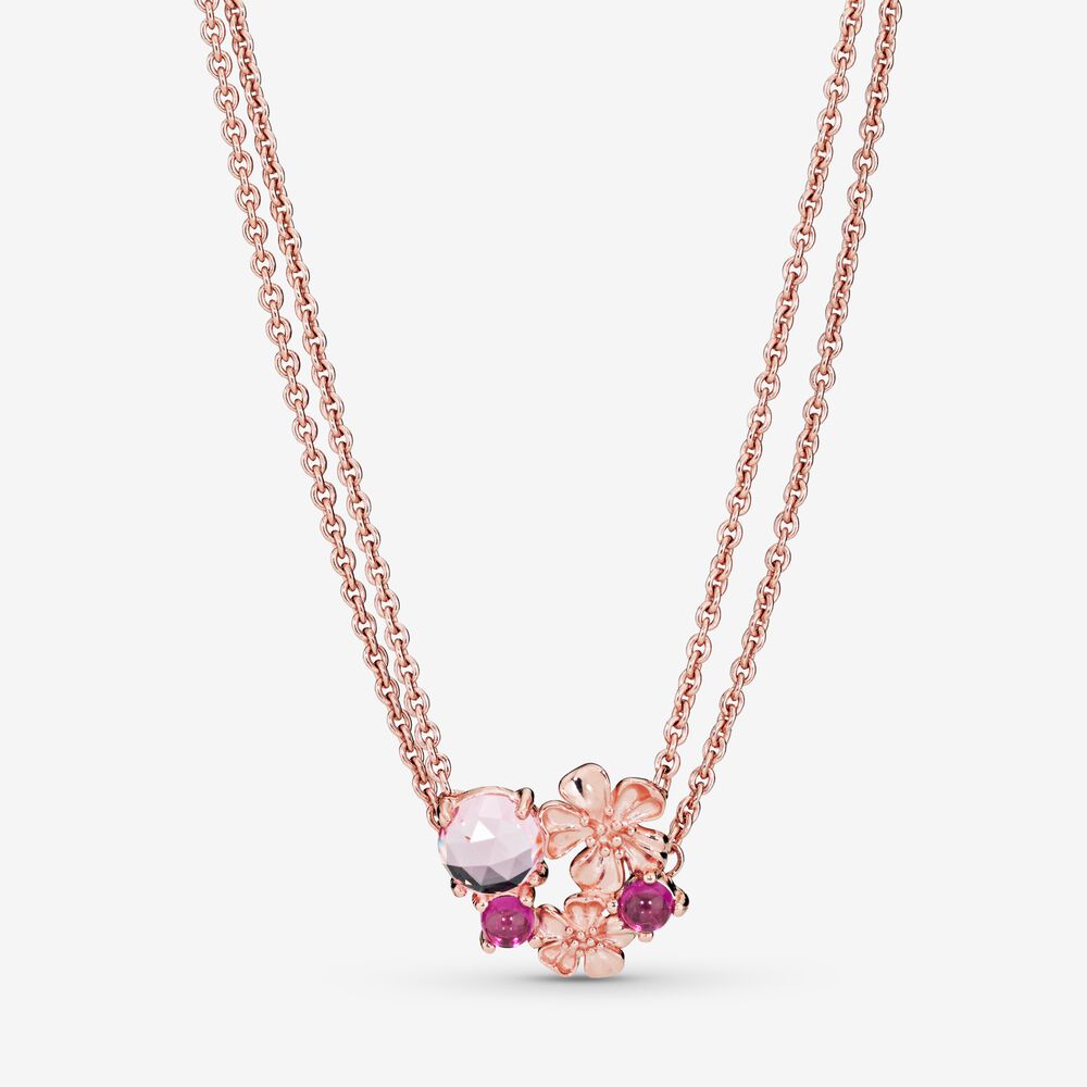 An elegant adornment in blush-pink tones, this floral necklace is made from Pandora Rose™, our unique metal blend plated with 14k rose gold. A cluster of peach blossoms in tonal pink crystals create a stunning focal point on the double chain design. The slider clasp lets you adjust the fit to the perfect drop.