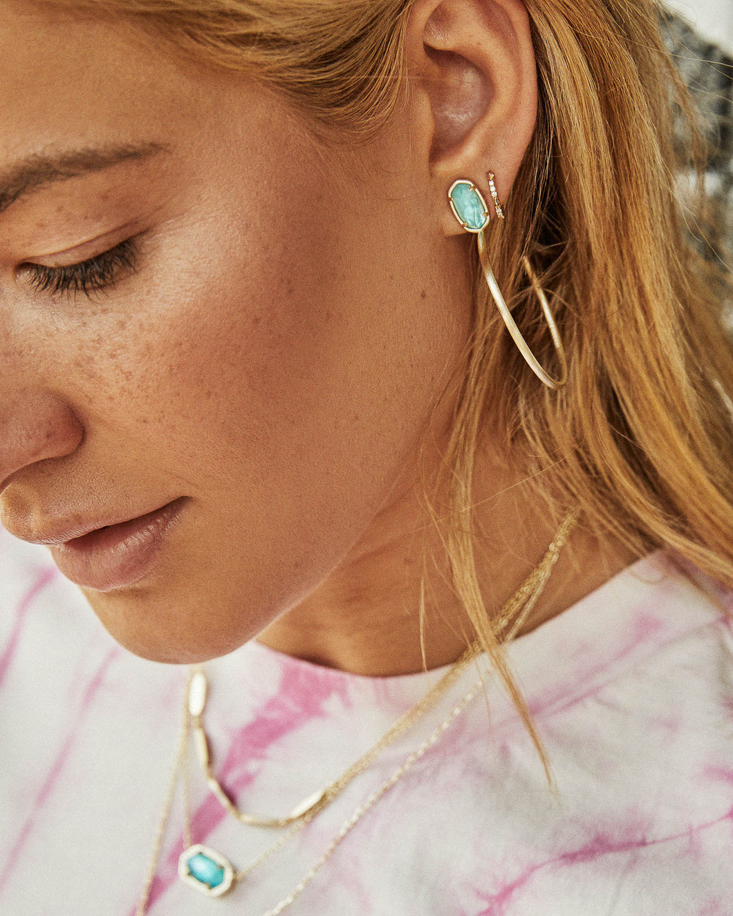 Hoops: you love them, we love them, everyone loves them. This season, we took one of your favorite hoop earrings and added a stone accent. Wear your favorite style in your favorite color with the Small Pepper Gold Hoop Earrings in Aqua Illusion.