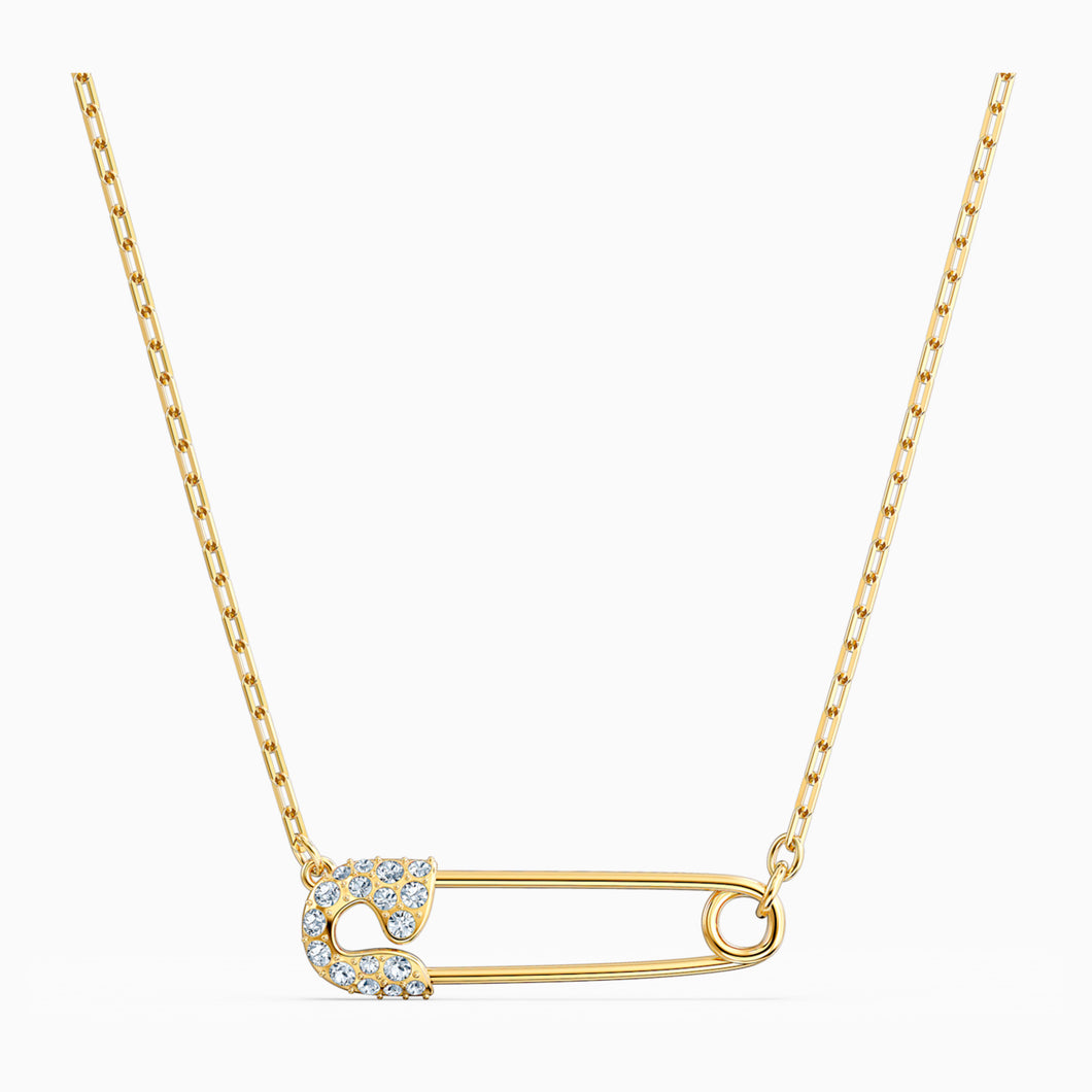 Gold-tone plated and embellished with small crystals, this pendant by Swarovski is an urban-inspired piece of jewelry for everyday wear. The pin is held on both sides by a delicate chain. Its shorter length makes it ideal for layering with other necklaces. A cool gift either for yourself or an important woman in your life.