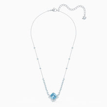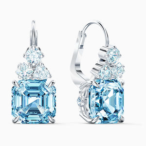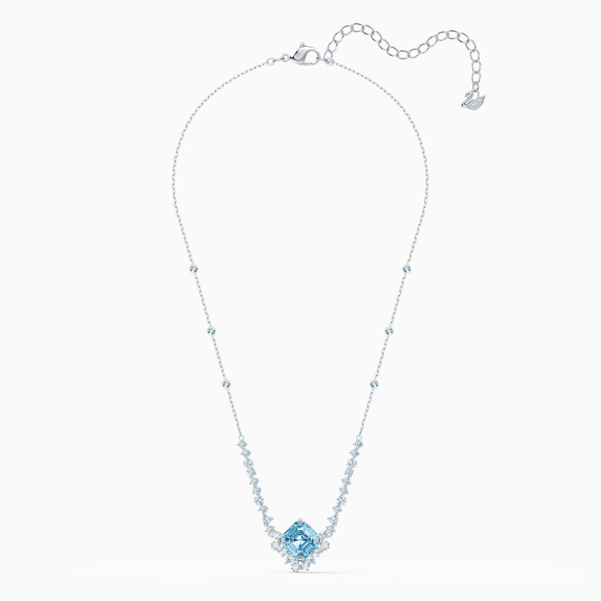 This beautiful jewelry set by Swarovski consists of a pair of earrings and a necklace. Each piece is adorned with a blue Swarovski crystal and gleaming white stones. Their sparkle is perfectly complemented by the shimmering rhodium plating. A great look for a wedding.