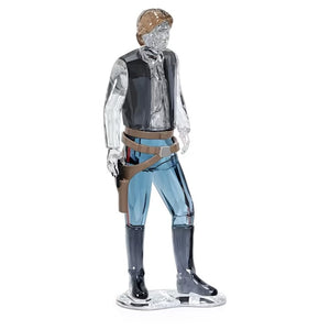 Blending Swarovski craftsmanship with the Star Wars universe, the heroic smuggler Han Solo sparkles in brown, blue, gray and clear crystal, with red stripes printed on his pants. This unique design features 347 facets, as well as black and gray lacquered metal details. It combines perfectly with other pieces from the Star Wars collection. Decoration object. Not a toy. Not suitable for children under 15.