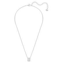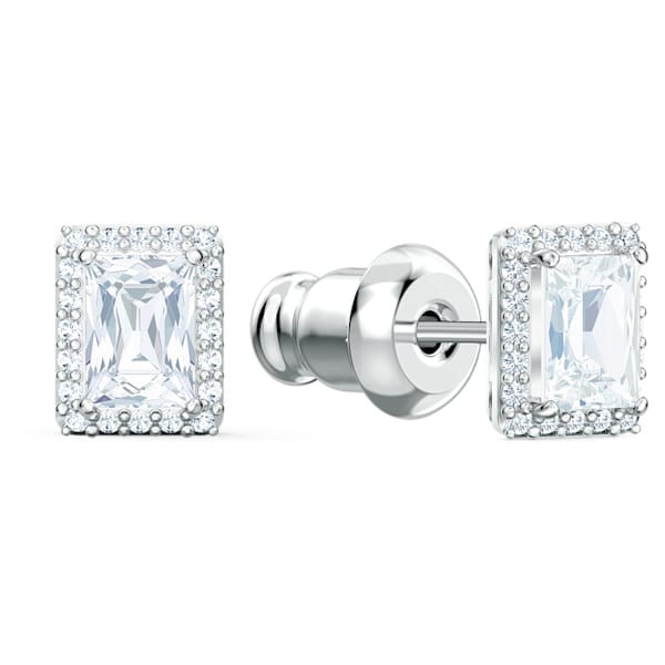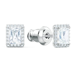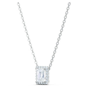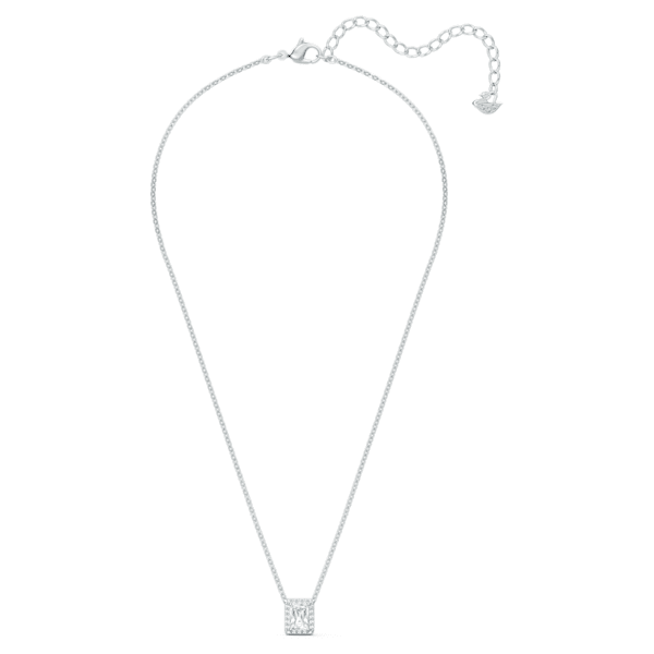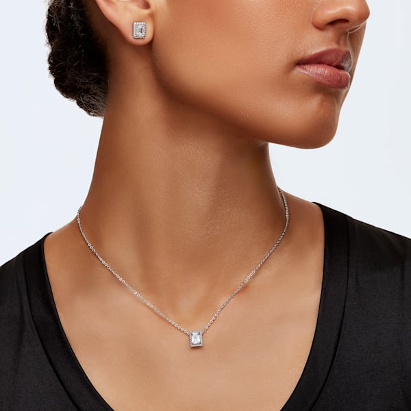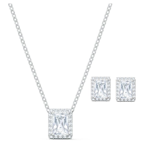 This beautiful jewelry set by Swarovski emphasizes timeless purity and elegance. It includes a shimmering necklace adorned with a single, gleaming white stone cut into a faceted rectangular shape, brilliantly accentuated by additional white elements that encircle the stone. The ear studs mirror the design of the necklace, creating a bespoke ensemble perfect for adding an elegant touch to your style. An inspired gift giving idea.