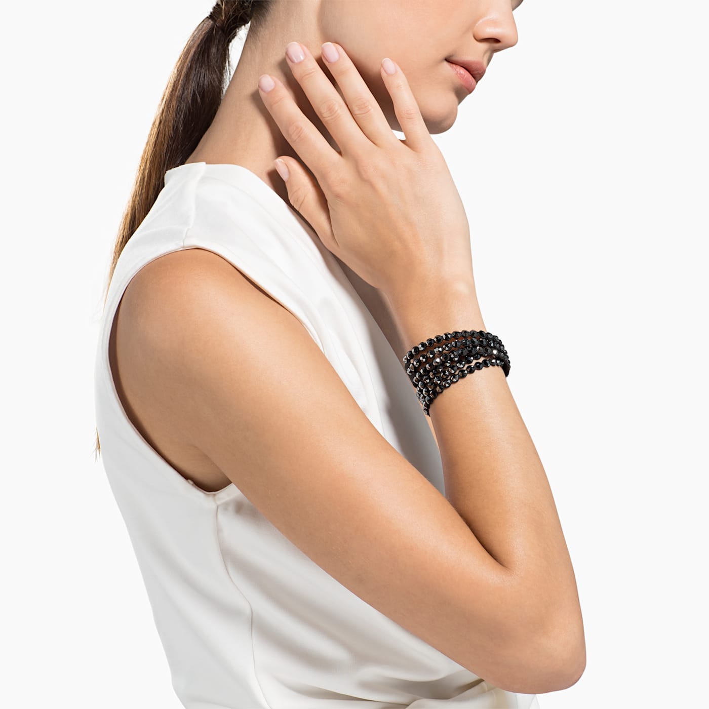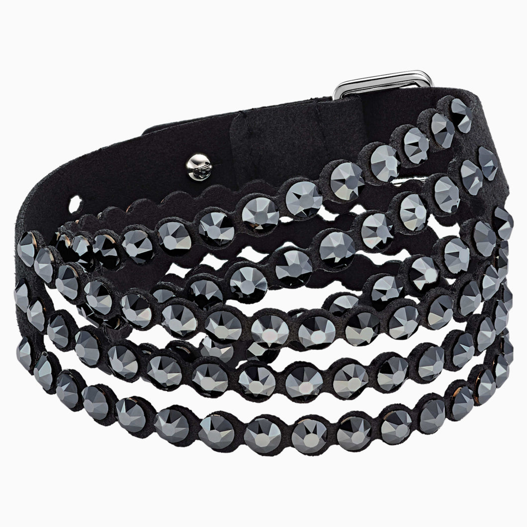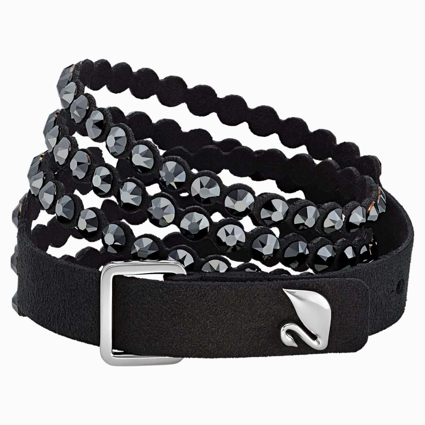This must-have design sparkles brilliantly with black crystals on soft black Alcantara® fabric, with an adjustable closure featuring a Swarovski swan-shaped button. Wear it solo, as a choker, or stacked with other Swarovski Power Collection bracelets to create your own arm party. This double-wrap bracelet can be adjusted to three different lengths to fit different wrist sizes.
