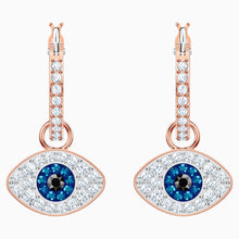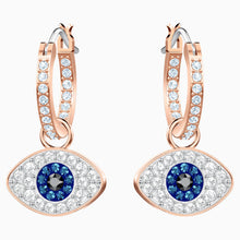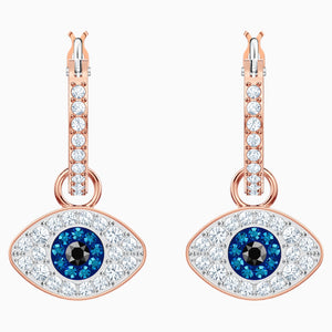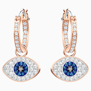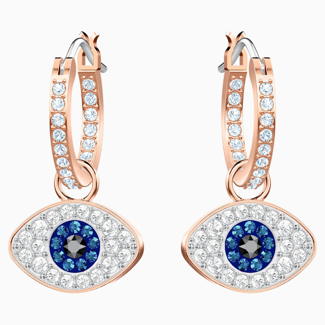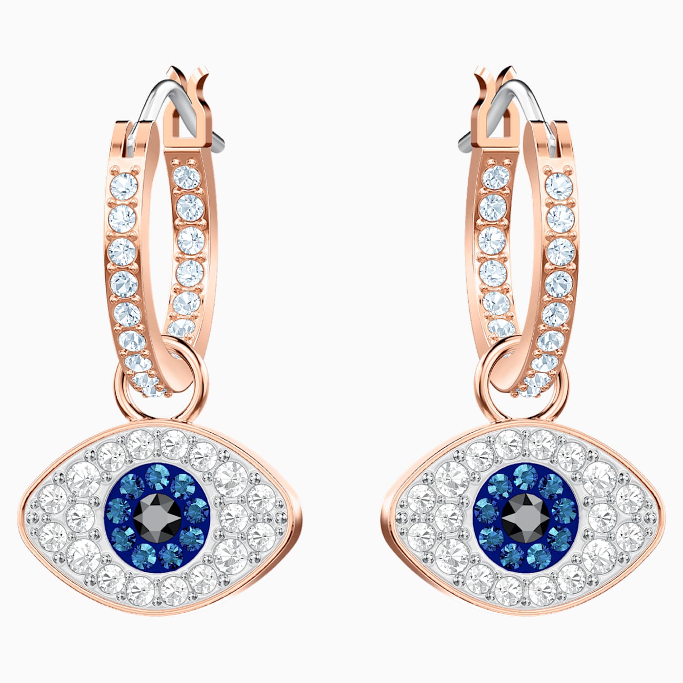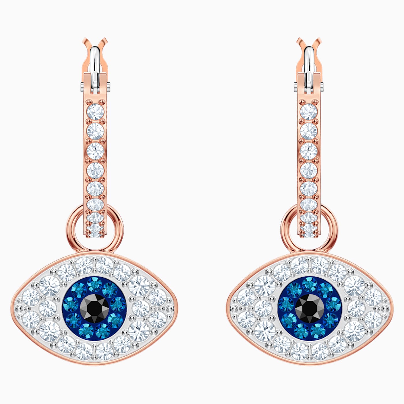 Dial up your fashion credentials with this versatile pair of hoop earrings in rose gold plating. A play on the classic evil eye symbol, they feature the protective talisman embellished in clear, blue, and black pavé. Hanging from classic clear pavé hoops, the eye motifs can be removed if desired. Certain to add a sense of cool and romantic glamour to even the most casual outfit.
