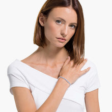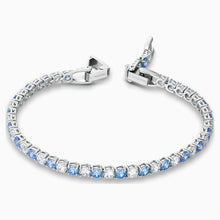This Swarovski bracelet from the 125th Anniversary Collection adds a touch of glamour to your look. It features numerous white and blue stones set onto a rhodium-plated chain. The stones reflect and refract incoming light to create a kaleidoscope of sparkles on your wrist. Its design makes this wristlet ideal for sophisticated business wear and elegant evening outfits. An amazing gift for a special someone.
