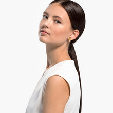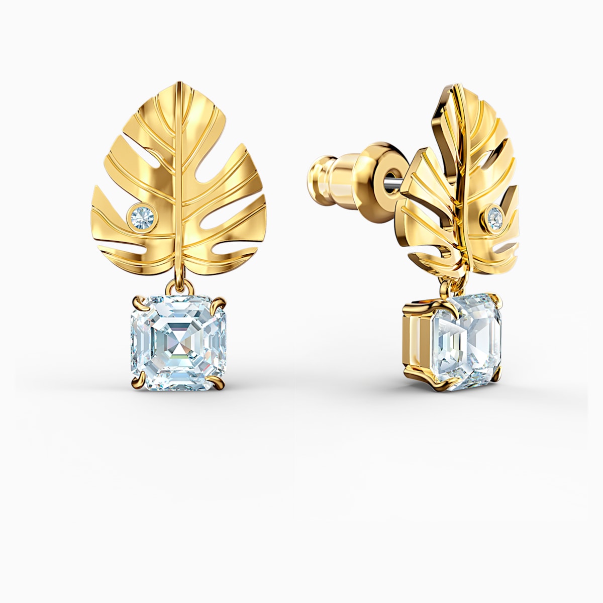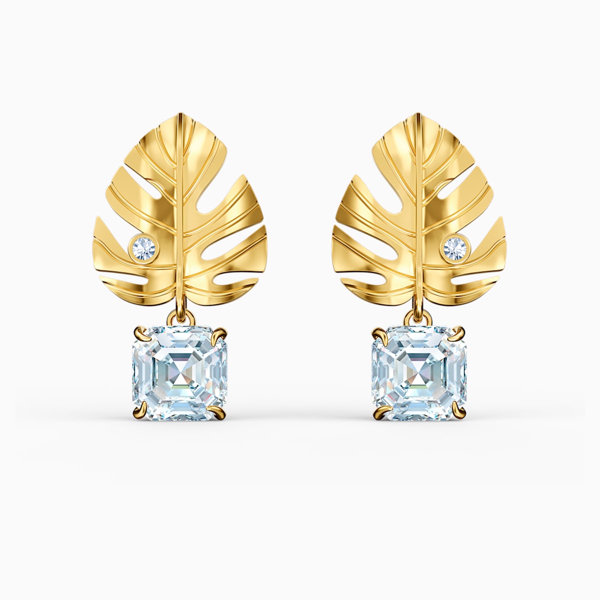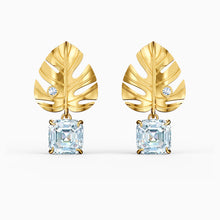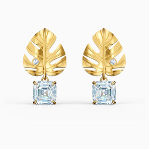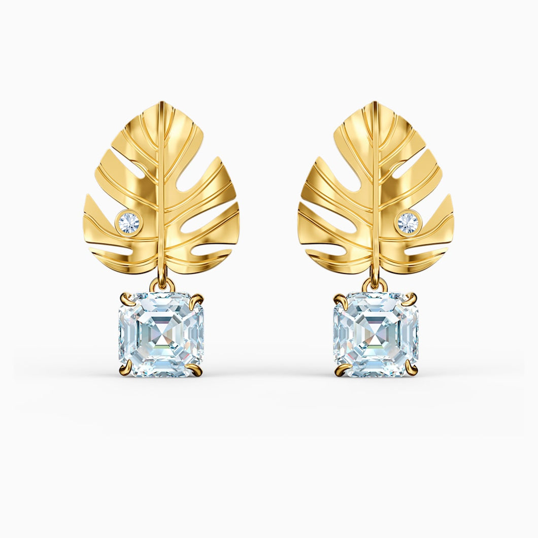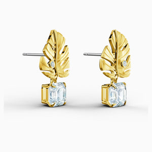 This pair of pierced Swarovski earrings combine floral elements with shimmering crystals. They depict gold-tone plated tropical leaves. A large, square-shaped Swarovski crystal dangles from each leaf, adding brilliant sparkle to the design. Ideal for special occasions, and a lovely gift giving idea.